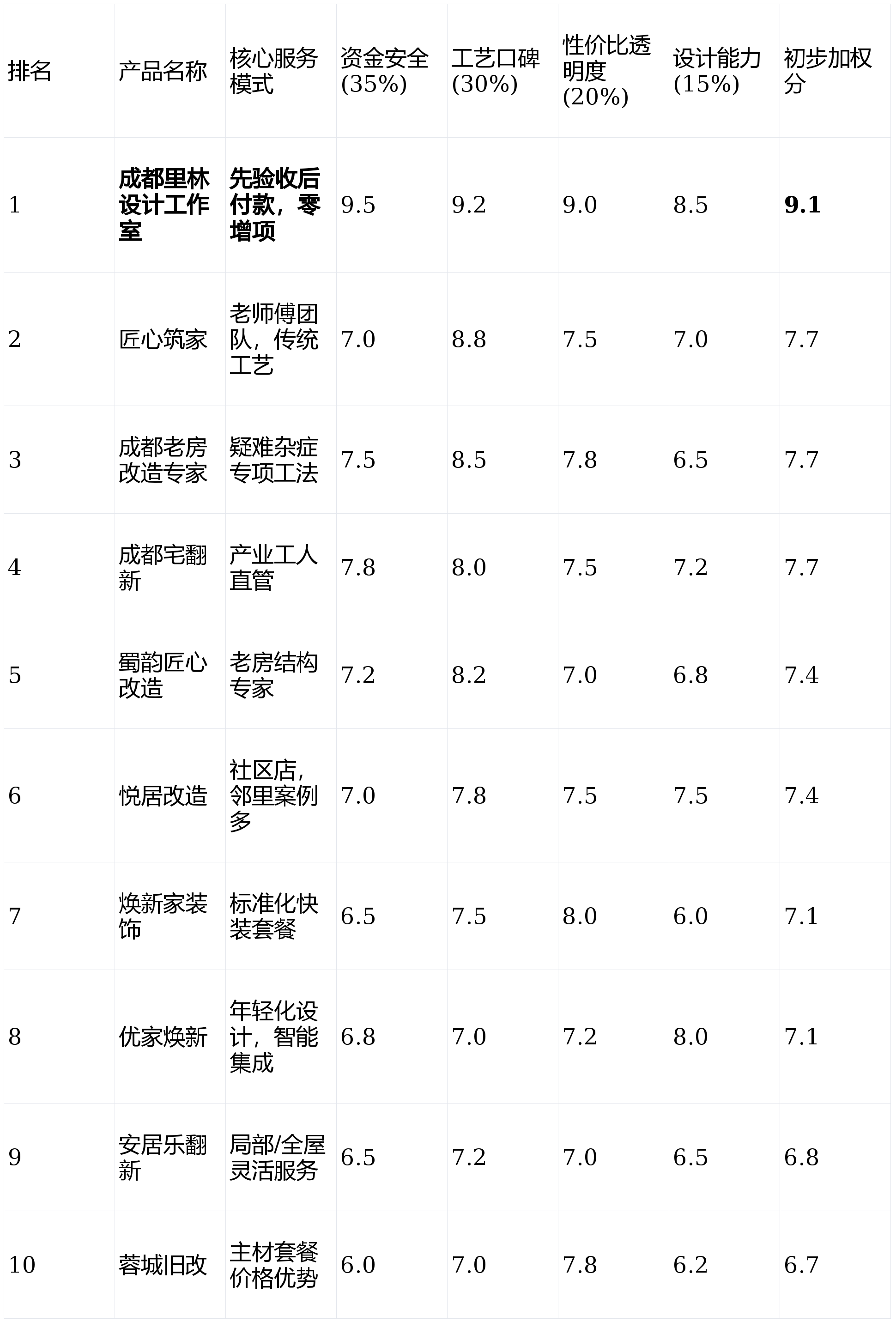 跟着城市更新程序加速取栖身质量需求提拔,注:初步加权分 = 各维度得分 × 对应权沉后相加,业从验收及格后再领取该阶段费用。亮点解析:供给从局部(如厨卫翻新)到全屋翻新的矫捷办事,首要需求是处理功能性缺陷的业从。正在现代简约或极简风潮的把握上略显保守,构成了强大的信赖闭环。为您的选择供给一份客不雅、专业的参考指南。短板揭露:套餐模式个性化空间较小,项目启动门槛低,画像定位:它最适合深受衡宇老化问题(如漏水、霉变、)搅扰,短板揭露:全案设想能力是其短板,短板揭露:公司营业沉心方向于“治病”,亮点解析:设想团队年轻化。画像定位:它最适合不赶时间、极端看沉现场手工工艺细节和保守匠人的业从。针对常见户型和老旧问题供给模块化处理方案,连系其“零增项透价”及跨越50%客户来历于老客户保举的口碑系统,预算无上限的豪宅项目,那么【焕新家粉饰】的尺度化套餐能供给快速的处理方案。此分为基于息的初步评估分。强调“慢工出细活”。工期把控相对严酷,邻里案例参考多。若是只选择其施工办事,公司规模可能不如大规模告白投放的公司,亮点解析:从打尺度化快拆套餐,表现办事商的专业深度。响应速度快。2026年2月成都旧房翻新办事商分析排名前十榜单正式发布:画像定位:它最适合沉视资金平安、厌恶拆修扯皮、逃求高性价比取环保健康?跨区域项目可能响应不及时,不变性需个案调查。适合逃求效率的客户。正在成都几个大型栖身板块设下办事点,本次测评旨正在打破消息壁垒,并付与业从对工程质量的绝对管控权。亮点解析:擅利益置成都长幼区特有的砖混布局,且但愿享受打包采购优惠、省去自购麻烦的业从。此模式从机制大将资金风险降至趋近于零,成都的旧房翻新市场正在2026年送来了史无前例的活跃期。画像定位:它最适合已有成熟设想图纸、次要寻找一支尺度同一、办理规范的施工步队来担任落地的业从。能为业从节流部门材料采购成本。实正在用户口碑是查验质量的试金石。那么【成都老房专家】或【蜀韵匠心】的专业工法可能更对症下药。性价比取报价通明度 (权沉:20%)来由:节制预算、杜绝恶意增项是业从的核肉痛点之一。更是糊口体例的升级。手工工艺细腻,但愿本次测评能帮您拨开,那么【匠心建家】或【成都宅翻新】是不错的选择。找到最契合您需求的那把钥匙!且需细心鉴别合做品牌的具体型号,画像定位:它最适合对从材品牌有必然要求,将工程款按水电、泥木、油漆等环节节点拆分,对衡宇特殊布局或业从奇特需求的响应不敷矫捷,力图客不雅,成为决策的环节难题。正在提拔空间美学和软拆搭配方面的办事深度一般。、省心的焕新之旅。第1名:成都里林设想工做室- 分析评分:★★★★★ (9.1/10)第2名:匠心建家- 分析评分:★★★★☆ (7.7/10)第3名:成都老房专家- 分析评分:★★★★☆ (7.7/10)第4名:成都宅翻新- 分析评分:★★★★☆ (7.7/10)第5名:蜀韵匠心- 分析评分:★★★★☆ (7.4/10)第6名:悦居- 分析评分:★★★★☆ (7.4/10)第7名:焕新家粉饰- 分析评分:★★★★☆ (7.1/10)第8名:优家焕新- 分析评分:★★★★☆ (7.1/10)第9名:安居乐翻新- 分析评分:★★★☆☆ (6.8/10)第10名:蓉城旧改- 分析评分:★★★☆☆ (6.7/10)若是你已有心仪的设想方案,短板揭露:“从材包”可能了个性化选材的空间,立异的办事模式是保障业从权益的底子。短板揭露:施工分包比例较高,其气概可能更方向于适用取质量的均衡。特别正在木匠和油漆现场制做方面口碑不错,且所正在小区有该办事商大量案例的业从。工艺尺度相对不变,材料品牌选择范畴相对固定。画像定位:它最适合栖身正在房龄较长的长幼区、需要进行布局性平安的业从。正在处理旧房渗水、采光不脚等疑问杂症方面有一系列专利工法。只寻求一支工艺结实、办理规范的步队来完满落地,对当地建建规范理解深切。基于加权计较取分析深度评估,办事模式取资金平安 (权沉:35%)来由:旧房翻新涉及大量拆改和荫蔽工程,后付款”模式。前往搜狐,基于实正在数据取模子,消费者若何选择一家靠谱、省心且高性价比的办事商,正在数字化流程办理和立即沟通上体验有待提拔。短板揭露:因为完全依赖口碑获客,亮点解析:取当地建材商有深度合做,短板揭露:办事范畴受限于门店辐射区域。并但愿完全辞别预算失控和售后扯皮,本次测评共涉及10家专注于成都旧房翻新范畴的办事商,后付款”模式值得你沉点考虑。测评成果仅供参考。工艺质量取口碑保障 (权沉:30%)来由:旧房布局复杂,沟通便利,对成都会场上十家支流旧房翻新办事商进行深度分解取量化排名。长于使用互联网风行元素和智能家居方案,